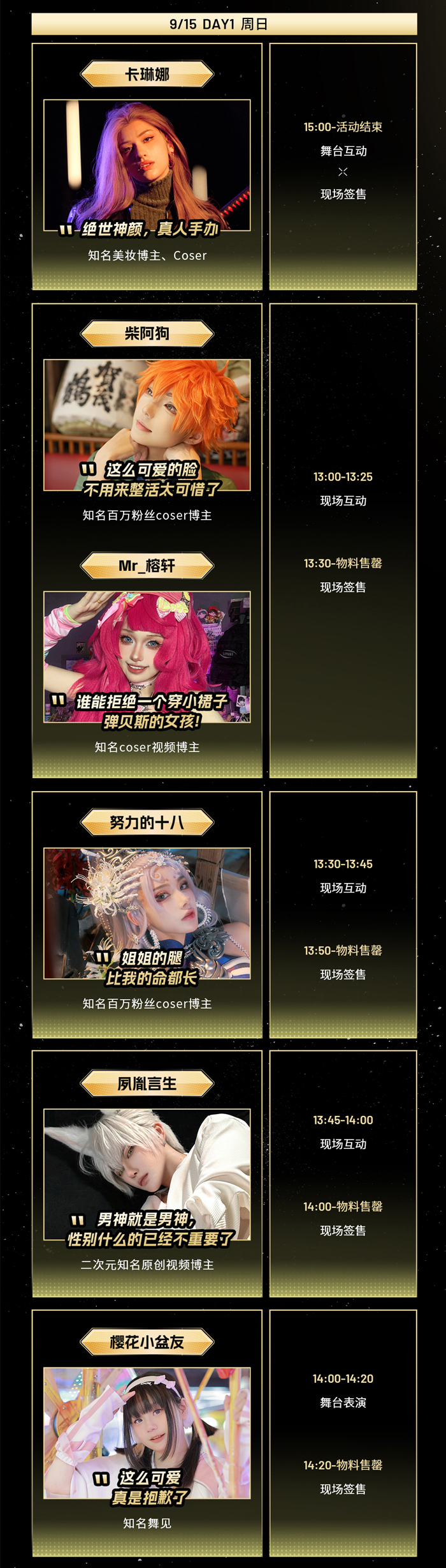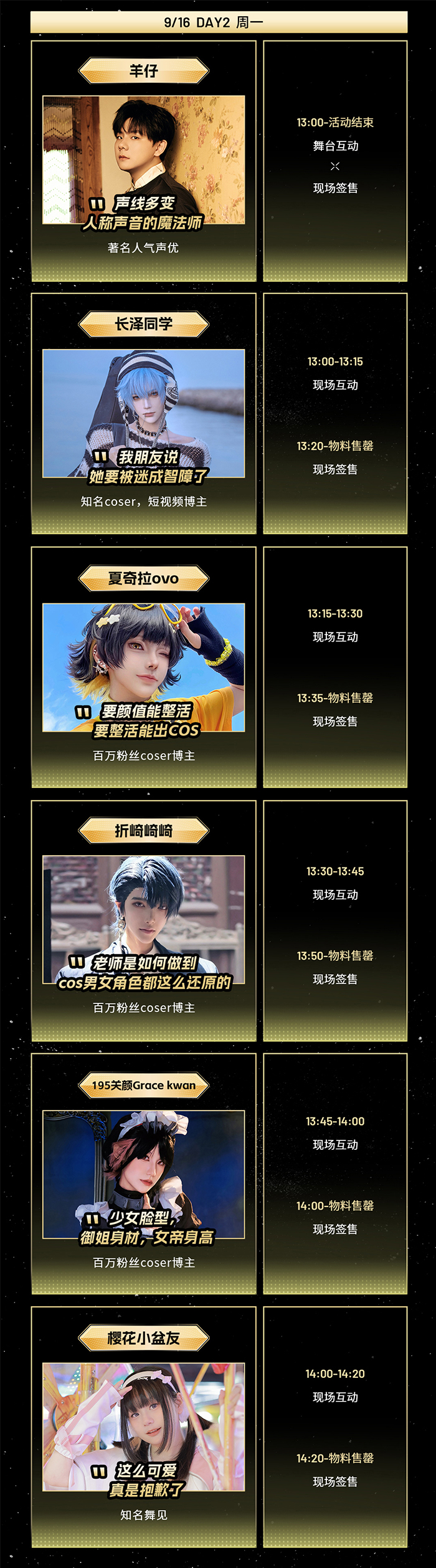 我们为大家设计的路线是:先观摩各位嘉宾的舞台互动,再前往内场签售区购买喜欢的嘉宾物料。每位嘉宾都有对应的舞台互动时间和物料签售的时间,请大家留意好日程表,不要错过喜欢的老师哦~