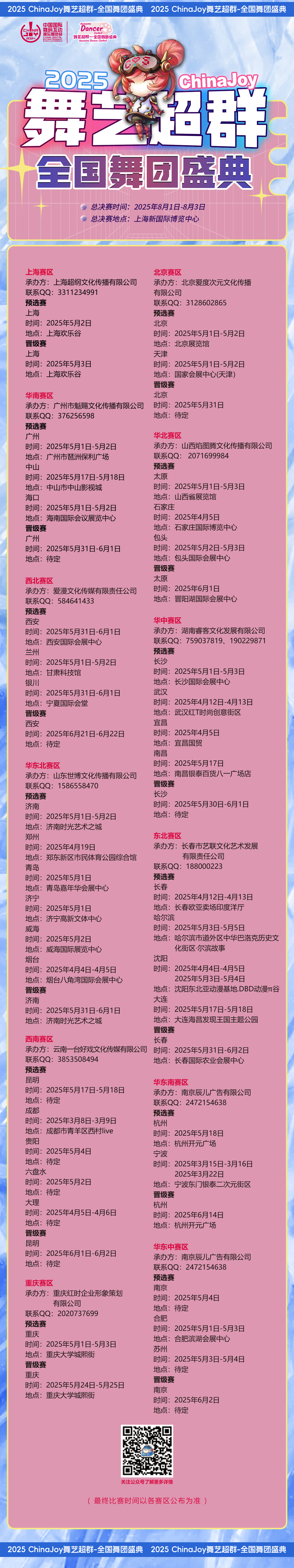 2025ChinaJoy舞艺超群-全国舞团盛典总决赛将于8月1日—8月3日在上海新国际博览中心举行,届时有超过百家媒体对赛事进行专业报道。现将各赛区比赛时间公布如下: