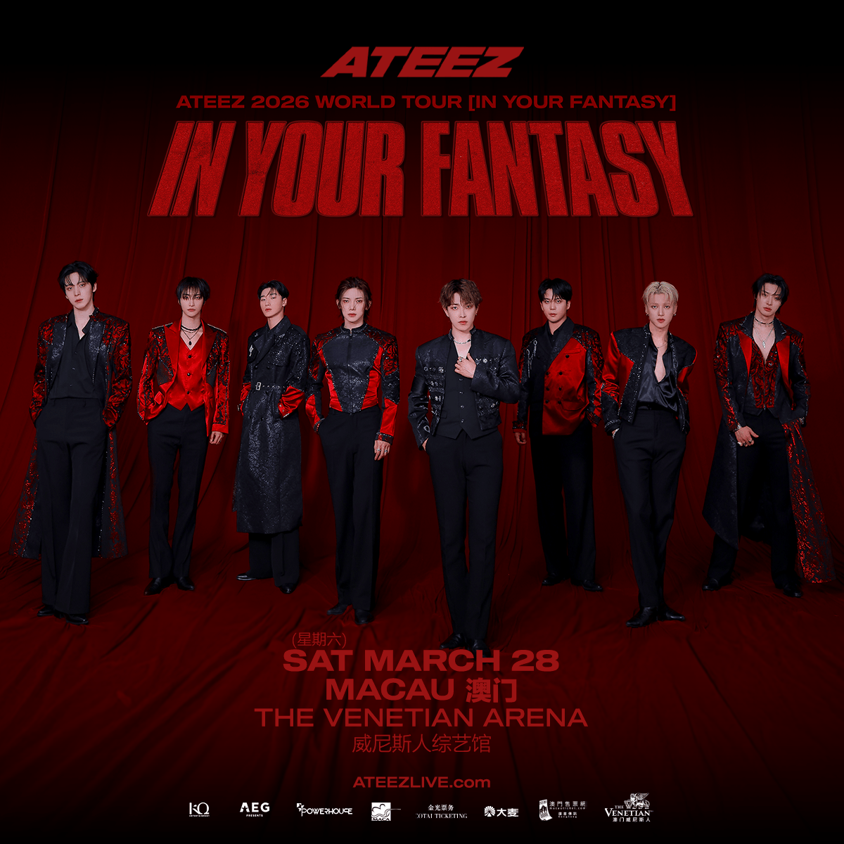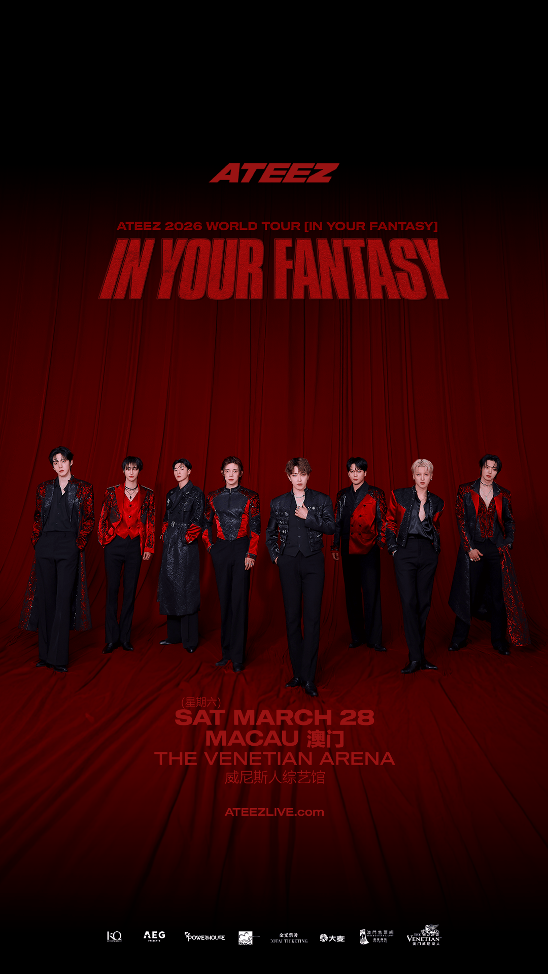 由 AEG Presents Asia 荣誉呈现 的 2026 ATEEZ 世界巡回演唱会 [IN YOUR FANTASY] 澳门站,将于 2026 年 3 月 28 日 在 威尼斯人综艺馆 盛大举行。